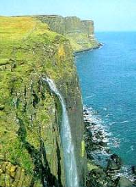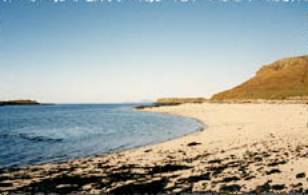 Near Dunvegan is Coral Beach. The white sand of this beach is not true coral but as at Plocton, is petrified seaweed. The Coral Beach is a beautiful sight with the sea and the hills of Harris beyond. It is a very popular outing. The usual way from Claigan, north of Dunvegan, is very short. A very good walk is from Loch Bay in Waternish, which is 5 miles each way but is less frequented … although the Bay River has to be forded. There is a no dogs sign at the beach.
