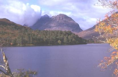 Liathach from Loch Clair The trail into the Cuilin Forest from Glen Torridon are easy and fairly level. The scenery on a good day is almost unsurpassed. The trails around Lochs Clair and Cuilin give a 5 mile cicuit suitable for cyclists or walkers. Alternatively the 8 mile one-way route leading over the Cuilin Pass will bring you back on easy but steeper paths through spectacular scenery to Achnashellac. Photo: Anne Burgess |