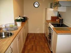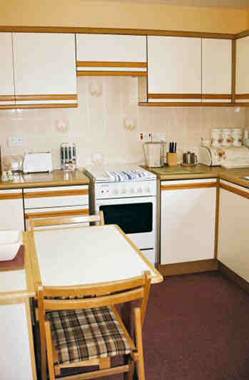 Kitchen with electric cooker, microwave oven, refrigerator, automatic washing machine, dishwasher. tumble dryer, ironing board, toaster etc.