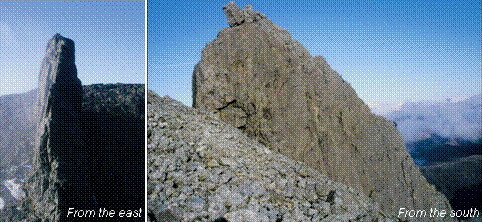 The ascent of the Pinnacle most often uses the long east ridge with descent by abseil off the short west side. The only Munro which requires a real rock climb (“moderate”) and it has significant exposure at times.