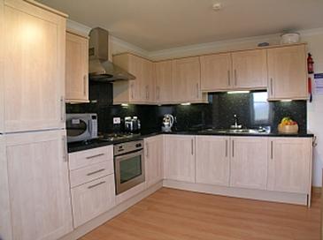 Kitchen with electric oven and hob, dishwasher, fridge/freezer, microwave,