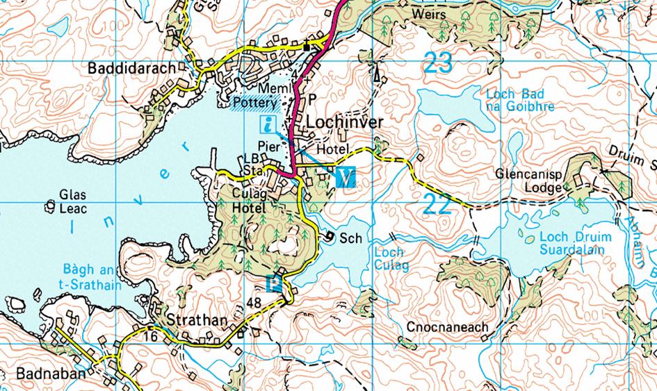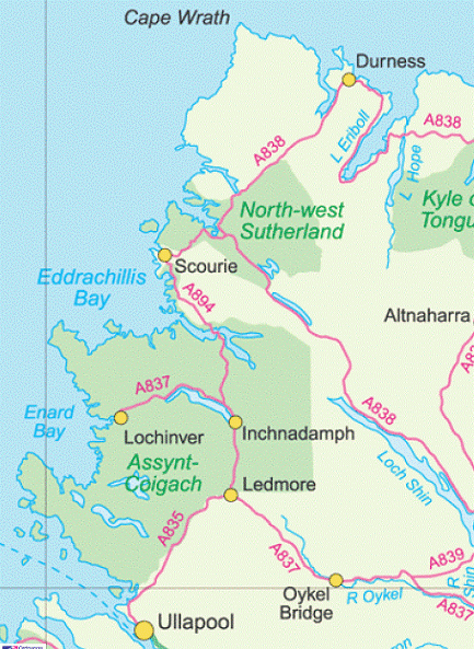 Coastal Walks There are many coastal walks: 1. Old Man of Stoer 2. Culnacraig to Strathcanaird (scambley in places) 3. Around Polbain including a circular over the low hill Meall an Fheadain 4. Around the peninsular east of Achnahaird (short walk) 5. Sandwood Bay Glen Canisp 1. From just north of Lochinver a track follows the river (gorge with tumbling rapids) to go over a low ridge and then drop down behind the Lodge 2. The track past the Lodge goes through (a long way!) to near Ledmore but also offers a circuit by turning north at Suileag and then following the river Allt na h-Airbhe to the hill track north of the Lodge |
