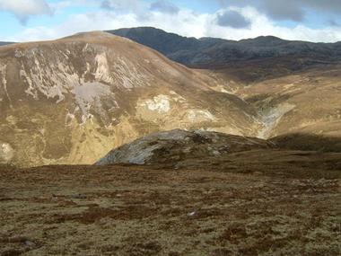 Photo: Jim Barton Breabag and Beinn an Fhuarain The limestone crag in the foreground contains the “Bone Caves” of Inchnadamph. They are named after the remains of a bewildering amount and variety of animal bones that were discovered here over a hundred years ago. There are three main cave entrances, named badger, reindeer and bone cave as you travel from west to east. Although they do not go in very far it is worth taking a torch. Behind is Breabag - the caves may be visited on the way to this Corbett or as an easy 3 mile walk on their own.