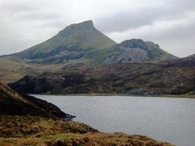 Suilven from the Glencanisp Lodge path from the west Suilven is a steep-sided ridge some 2 km in length. The highest point, known as Caisteal Liath (the Grey Castle in Scottish Gaelic), lies at the Lochinver end. From the coast Suilven looks like a large grey pillar, hence the name which it was given by sea-borne Vikings From Glencanisp Lodge a path leads across undulating moorland toward the mountain, which will be seen clearly ahead. Shortly after crossing Abhainn na Clach Àirigh (a river a boggy path leads towards Suilven, reaching Bealach Mòr (the Great Bealach) after a little over 2 km. The final pull up to the bealach is steep, and the path is much eroded, but from here the summit is easily attained. The summit , broad and grass, is almost totally surrounded by vertical cliffs. The views are extensive! From the summit you can return via Inverkirkaig, some 4 km south of Lochinver: by leaving the bealach towards the south, passing Kirkaig Falls on the way or by a more exciting traverse of the ridge (some exposed scrambling is required, particularly between Meall Meadhonach and Meall Beag.). Even by Scottish standards routes to Suilven are longish days; often around 25 km in length over rough terrain - though a simple there and back from the Lodge will shorten this considerably. |