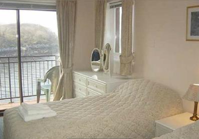 Twin bedroom with patio doors to balcony overlooking the sea.