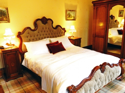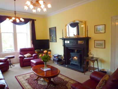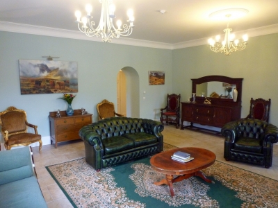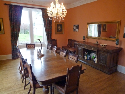 The big drawing room is lovely with its gold cornicing and large bay windows and open fire and the main hall with its beautiful staircase wood panelling and stags head echo the Victorian splendour of the heritage. The hall is so large it can act as a second sitting room also with a big welcoming open fire.