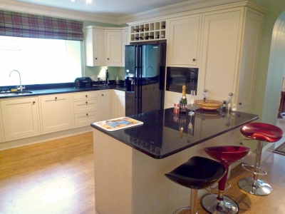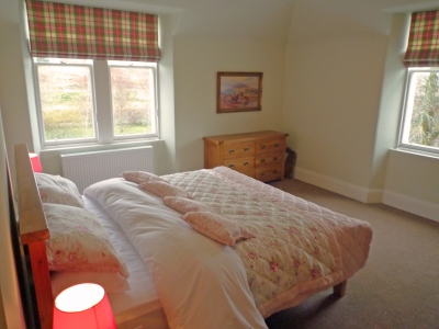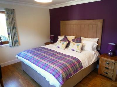 The Stalkers Lodge has been completely renovated, and extended. All on one level, the living and sleeping accommodation is very spacious with large rooms and hallways, making it ideal for elderly or less mobile guests. Tiled flooring and light coloured walls in the kitchen, dining and living areas are complemented with rich coloured oriental rugs and paintings. The large kitchen/dining area has wall and base cream painted wooden units with solid wood worktops, double oven and hob, large antique dining table and seating. Patio doors open to a large decked patio area with plants and outdoor furniture. An archway leads off to the lounge, with wood-burning stove, comfy leather sofas, flat screen satellite TV, occasional mahogany tables, and large picture windows. All bedrooms have laminate wooden floors and furniture, and are decorated individually in vibrant colours with matching accessories, fabrics and seating. The master super king bedroom has private facilities, and there is an additional family bathroom, and shower room. The exterior of Stalkers Lodge is clad throughout with larch, and the front of the house is paved in grey stone providing further outdoor seating areas, and ample parking.
