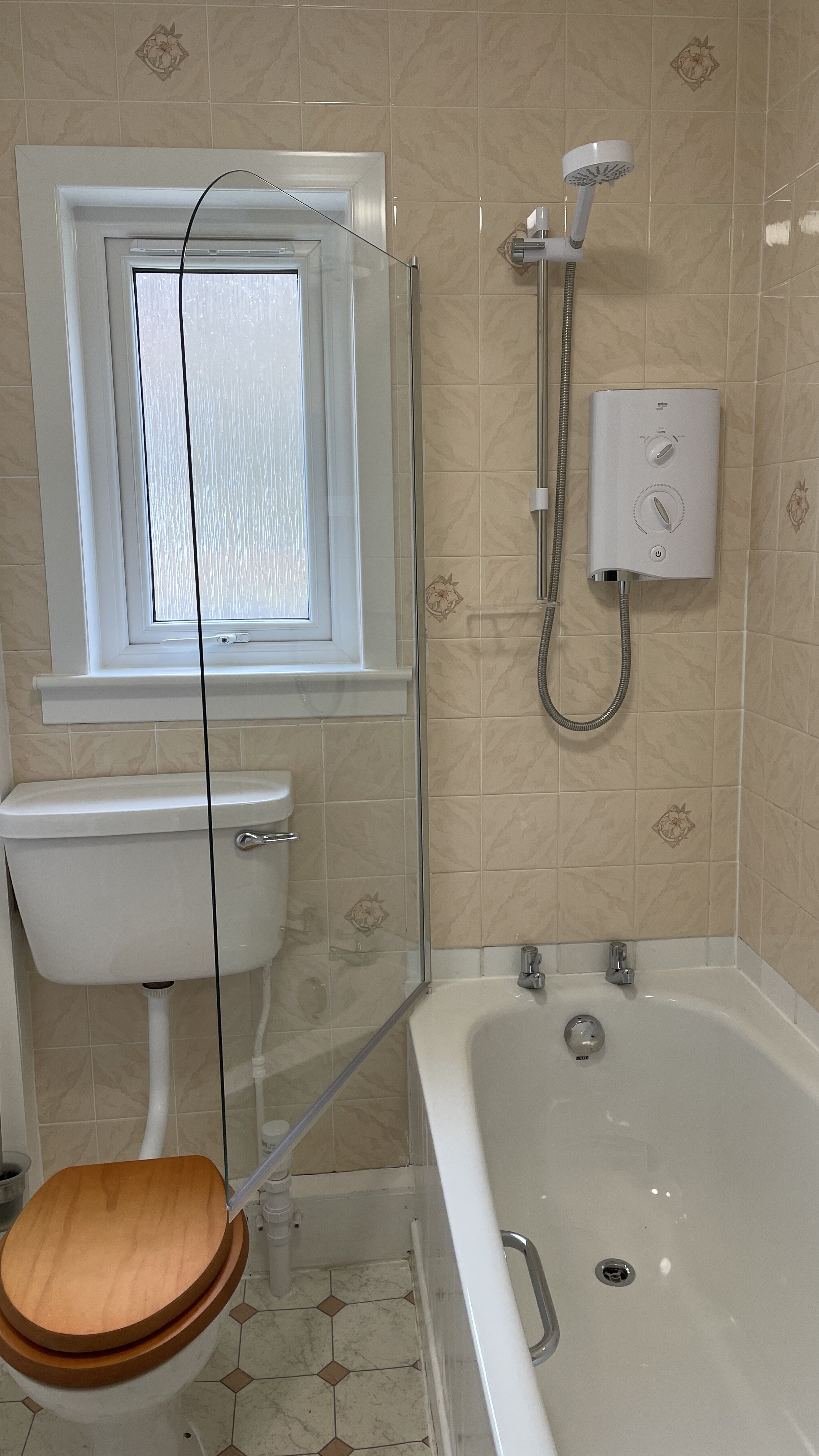 Electric shower over the bath or shower cubicle. Heated towel rail