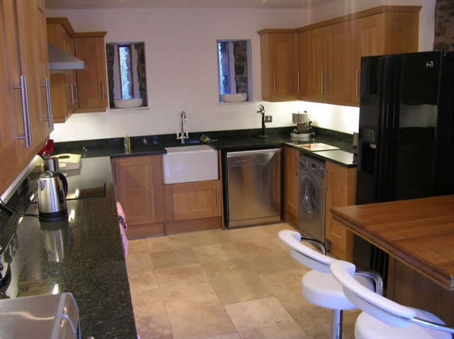 granite work surface, stone Belfast sink and travertine marble floor.