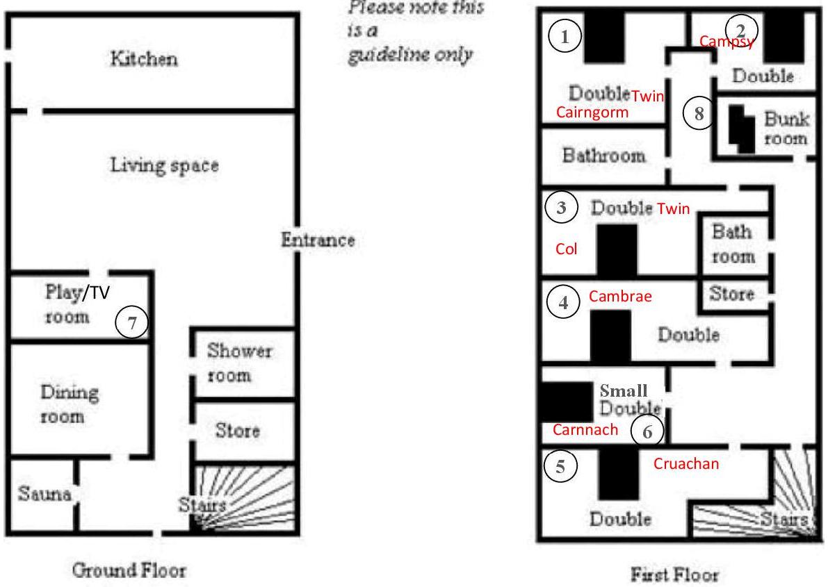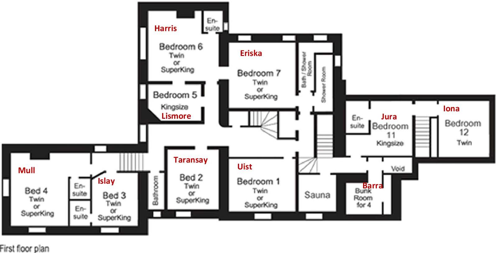 & Second Floors Bedrooms (Most rooms feature antique mahogany chests of drawers, wardrobes, and mirrors.) 4 Twin or Superking 3 Twin or Superking ensuite 2 Kingsize double 1 Kingsize double ensuite 1 Triple singles 1 Family (double + bunks) There is also a 4 berth bunk room which we may not use) Other rooms 2 Bath / Shower + 1 on the 2nd floor Sauna |