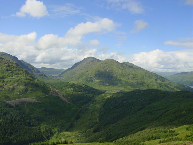 Seen from the south with Glen Inverglas running across the photo The easiest ascent is from the dam visitor centre on the A82. More interesting is from Ardlui taking in "Little Hills" (to the right) Beware! The trigpoint is 2-300 yds south of the summit. |