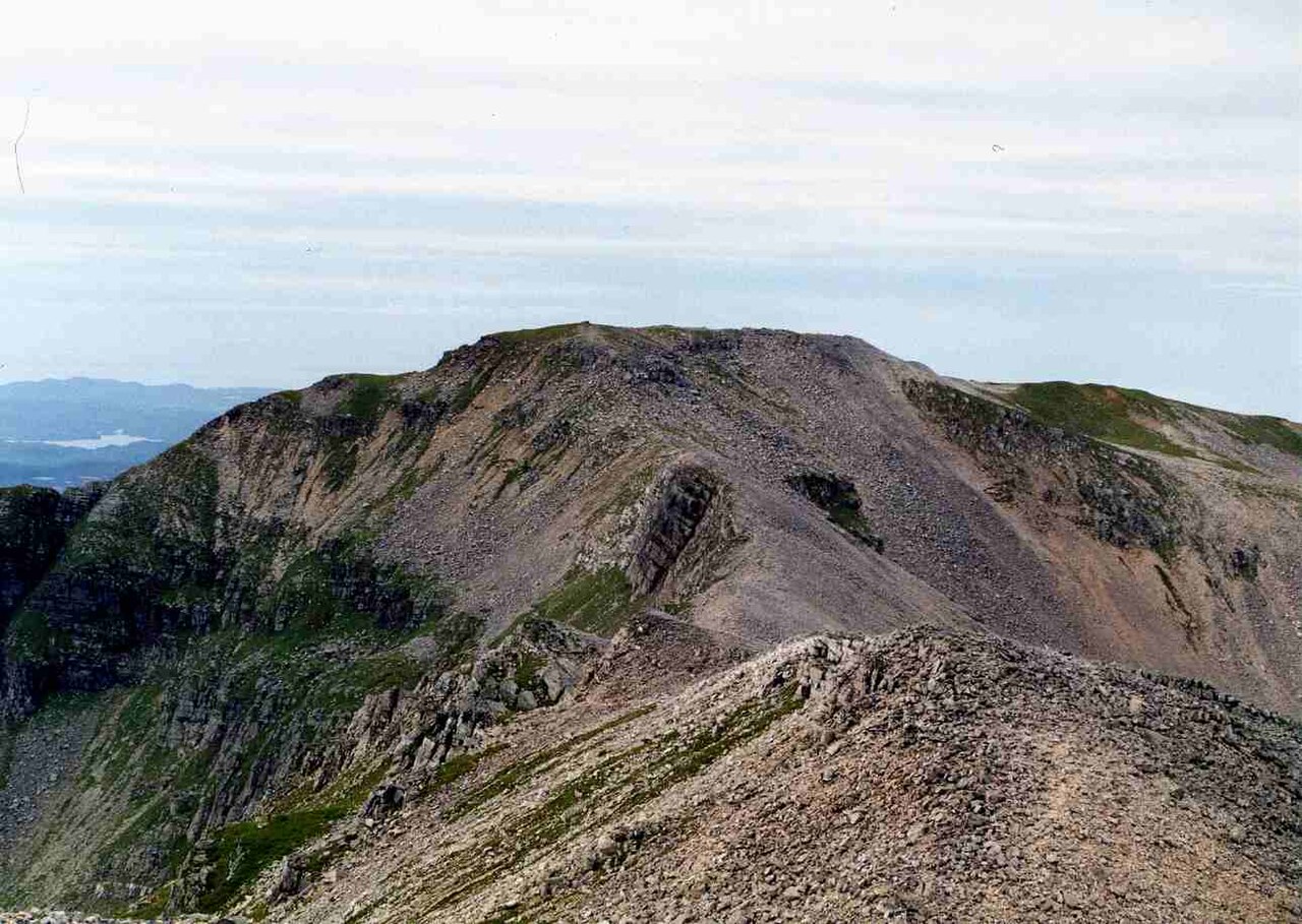 Seen here from the west on Ben More Assynt. Often climbed with Ben More Assynt from Inchnadamph In 2002 a few of us (including 2 Clives & Bob) found the South East ridge of Conival to be fun scramble! |